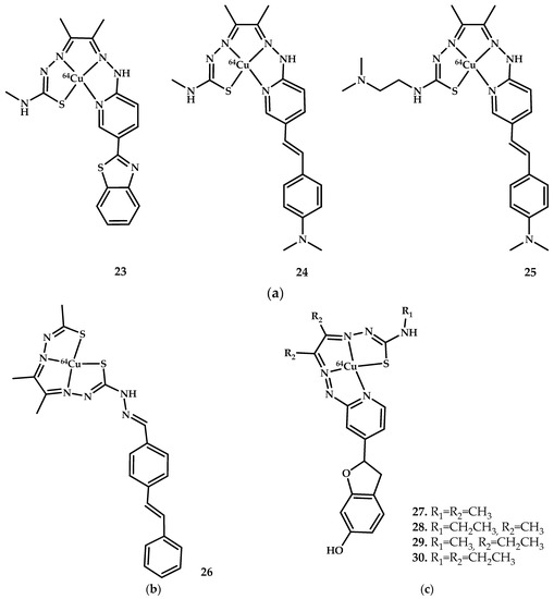 The ability of copper coordination compounds to successfully penetrate the blood-brain barrier has inspired some researchers to create copper-based preparations for visualizing pathological changes in Alzheimer’s disease. One of the major pathological hallmarks of the disease is the presence of extracellular senile plaques in the brain, consisting of an insoluble aggregated peptide called amyloid-β (Aβ), a 39−43 amino acid peptide [55]. Clinically used derivatives of benzothiazole, stilbene, and stripylpyridine labeled with 18-fluorine or 11-carbon are used for PET imaging of plaques by binding to a hydrophobic pocket of the peptide [56,57]. In addition, Zn2+ and Cu2+ cations have been proven to promote aggregation of amyloid plaques, which provides them with an advantage in binding to amyloid due to the increased consumption of these metals by amyloids [58,59].