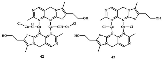 Brandão et al. reported Cu(II) coordination compounds based on thiochrome, the oxidized form of vitamin B1, with promising cytotoxic activity [66]. The ligand was obtained by oxidizing thiamine with copper (II) chloride. The resulting coordination compounds crystallize in the form of two structures, compounds 42 and 43 (Figure 11). Biological studies on human colon adenocarcinoma cells Caco-2 showed that both compounds reduce the viability of these cells more than thiamine or thiochrome. To investigate the mechanism responsible for the cytotoxic effect of compounds 42 and 43, the authors tested the alleged involvement of changes in oxidative stress levels. By adding N-acetylcysteine, they ruled out ROS formation, which ultimately showed no change in the cytotoxic effect of compound 42 and only a slight decrease in the cytotoxicity of compound 43. Therefore, oxidative stress does not seem to play an important role in the mechanism of biological action of these compounds, which indicates that the ability to generate ROS is important but is not always the main mechanism of the cytotoxic action of copper coordination compounds. A comparison of the cytotoxic activity of these compounds on cell lines (IC50 = 146 μM for compound 42 and IC50 = 191 μM for compound 43) with cisplatin (IC50 = 274 μM) shows that these copper coordination compounds are more effective on human colon adenocarcinoma cell line of heterogeneous human epithelial colorectal adenocarcinoma Caco-2.