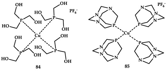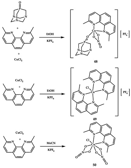 Sliwa et al. reported synthesis, characterization, and biological activity of three water-soluble copper(II) complexes [Cu(NO3)(PTA=O)(dmphen)][PF6] 48, [Cu(Cl)(dmphen)2][PF6] 49, and (Cu(NO3)2(dmphen)) 50 [69] (Figure 14).