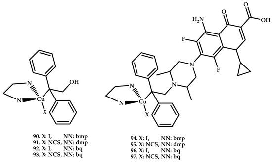 The authors associated the action mechanism of coordination compounds 32–41 with interactions with the bacterial chromosome, which led to a decrease in bacterial reproduction. The redox activity of copper ions is dependent on the presence of reducing agents. This thiol is glutathione in most Gram-negative bacteria and bacillithiol in several Gram-positive bacteria [65]. Coordination compounds 40 and 41 based on Pt and Pd do not show significant antimicrobial activity, which also indicates that the antibacterial activity is associated with the redox/nuclease activity of copper ions.