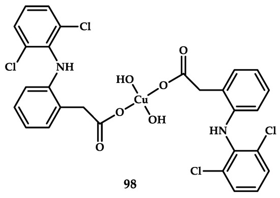 - Sayen, S.; Carlier, A.; Tarpin, M.; Guillon, E. A Novel Copper(II) Mononuclear Complex with the Non-Steroidal Anti-Inflammatory Drug Diclofenac: Structural Characterization and Biological Activity. J. Inorg. Biochem. 2013, 120, 39–43. [Google Scholar] [CrossRef] [PubMed]