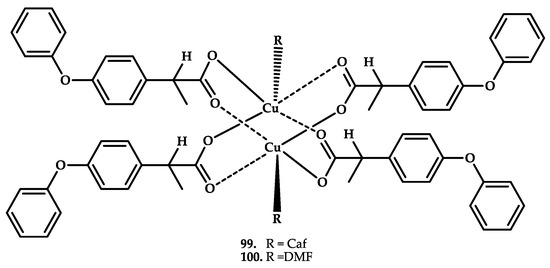 Three copper complexes with potential anticancer and nonsteroidal anti-inflammatory activity were reported by Hussain et al. [68] (Figure 13). Coordination compounds 45–47 with benzimidazole-derived scaffolds were synthesized in accordance with the following scheme. In addition to antitumor activity, the compounds were proposed as potential candidates for NSAIDs.