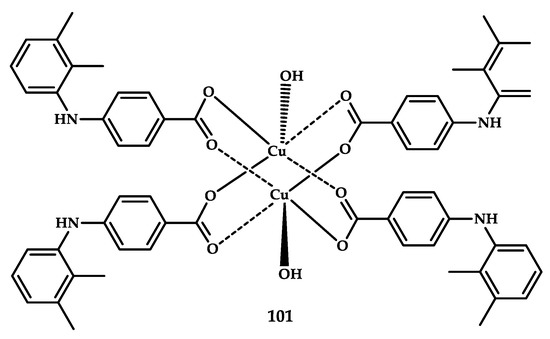 An Annexin/FITC assay showed that the three complexes 45–47 exhibited an increase in apoptotic cells to a significant level followed by necrosis. Glutathione depletion along with ROS formation in MCF-7 cells after treatment with coordination compounds 45–47 was also shown. The interaction of complexes with COX-2 inhibitor was also confirmed, which can be a mechanism of action of these potential NSAIDs. Coordination compounds 45–47 were tested in vivo on albino rats and mice for anti-inflammatory, antipyretic, and analgesic activities. The results showed that 45 and 47 have significant dose-dependent anti-inflammatory and analgesic activities at a lower concentration.