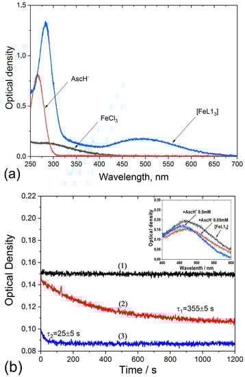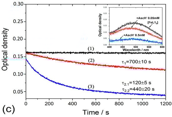 (a) Absorption spectra of ascorbic acid (0.05 mM), FeCl3 (0.05 mM), and [FeL13] chelate complex (0.05 mM) in a water solution at pH = 4.8; (b) time profile of the changes of optical density at 525 nm of FeL13 chelate complex aqueous solution at pH = 7.4 in the absence (1) and presence of ascorbic acid at 0.05 mM (2) and 0.5 mM (3) at room temperature (25 °C); (c) similar time profiles measured at pH = 4.2.