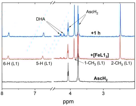 To find out whether the decay of the mixed chelate complex in acidic media results in oxidation of ascorbic acid, we applied the NMR technique. The formation of DHA in the reaction of ascorbic acid with the FeL13 chelate complex in a weak acidic solution was confirmed by 1H NMR spectroscopy. Figure 3 shows the appearance of the DHA signal after the addition of FeL13 complex to the ascorbic acid solution, with further increases in the amount of product during the next hour. We can assume that further decomposition of ascorbic acid occurs due to the release of ferrous ions from the L1 complex [39,54] and its oxidation by dissolved oxygen [10]. The concentration of ascorbic acid in this experiment was 0.4 mM, and the concentration of FeL13 was 0.1 mM.