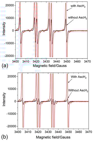 EPR spectra of TMIO–OH spin adduct in the absence (black) and presence (red) of ascorbic acid (a) without L1 and (b) in the presence of 3 mM L1. Experiments were performed at room temperature in distilled water at pH = 3.3; reaction mixture: 20 mM TMIO; 3 mM FeCl3; 12 mM H2O2; 10 mM ascorbic acid.