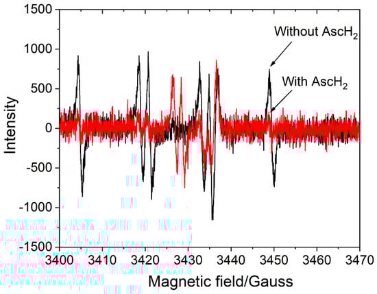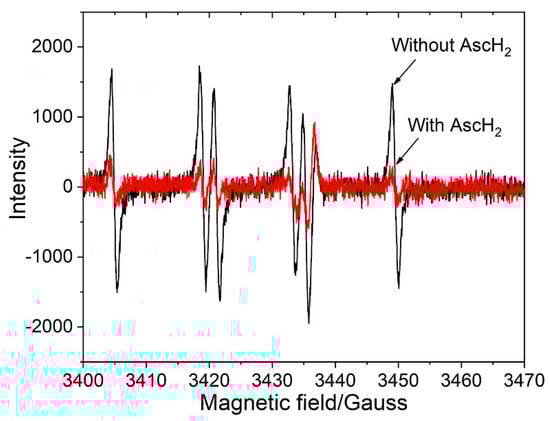 EPR spectra of TMIO–OH spin adduct in the absence (black) and presence (red) of 100 mM ascorbic acid in the presence of 6 mM L1. Reaction mixture: 20 mM TMIO; 3 mM FeCl3; 12 mM H2O2; pH = 3.0.