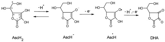The structure of ascorbic acid and the main products of redox reactions. Ascorbic acid—AscH2.; ascorbate anion—AscH−; ascorbyl radical—AscH•; dehydroascorbic acid—DHA.