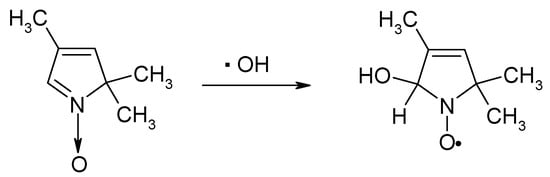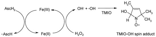 A number of EPR spin trapping studies have demonstrated the production of reactive oxygen radicals during the oxidation reaction of Fe2+ to Fe3+ ions with hydrogen peroxide (see Scheme 3) [67,68,70]. In this context, the method of spin trapping allows the transformation of extremely short-lived radicals to long-lived ones, and is successfully used in the study of biologically relevant free radicals, especially ROS, such as hydroxyl radical, peroxyl radical, and singlet oxygen [55,56,57,64,71]. It has been shown that the use of the TMIO spin trap (2,2,4-trimethyl-2H-imidazole-1-oxide) has certain advantages over the widely used DMPO (5,5-dimethylpyrroline-N-oxide) and PBN (α-phenyl N-t-butyl nitrone) spin traps in the trapping of several types of radicals and in the interpretation of molecular mechanisms involved in the reaction [55,56,64].