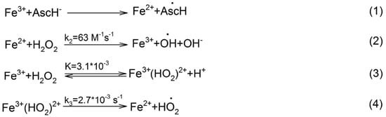 Considering the possible biological role of ferrous ascorbate complex, the main question is whether this complex is redox-active or not. Some recent studies have confirmed the redox activity of a mixture of ascorbic acid with Fe2+ in the Fenton reaction [83,84]. For example, oxidation of benzoic acid by the Fenton reaction occurs more effectively in the presence of ascorbic acid [85]. The initial reactivity of ferrous ascorbate with hydrogen peroxide is the same as that of free ferrous ions. However, when Fe2+ is oxidised to Fe3+, the reaction rate decreases by one order due to the slow reaction of Fe3+ with hydrogen peroxide (see Scheme 3). Furthermore, in the presence of ascorbic acid the starting reaction rate is kept high due to the fast transition of Fe3+ to Fe2+ [85].