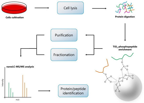 Phosphoproteomics is a branch of proteomics that identifies, characterizes, and quantifies proteins possessing phosphate groups in their structure. It often uses liquid chromatography–mass spectrometry/mass spectrometry (LC–MS/MS) as a sensitive and specific detection method that is robust both for identification and quantification of phosphoproteins, including localization of present phosphorylation in their primary structure [4,5]. The main advantage of the MS-based phosphoproteomics is the ability to analyze a large number of proteins at once. The use of a high-resolution LC–MS/MS method for this purpose has been particularly advantageous in this regard. However, due to the relatively low stoichiometry of phosphoproteins in the whole proteome, specific methods leading to the enrichment for phosphopeptides in the bottom-up phosphoproteomics are necessary for a successful analysis.