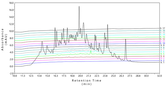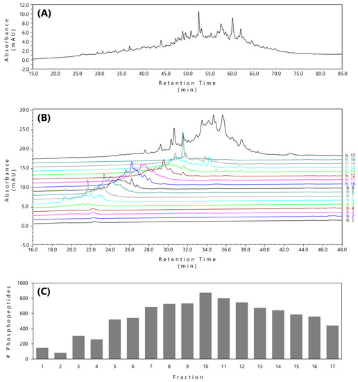 As previously, at first, we analyzed the purified sample and all 17 fractions by HPLC. The purified phosphopeptide sample provided a typical LC–UV chromatogram (Figure 3A). Chromatograms of the fractions from the fractionated sample indicated successful fractionation of the TiO2-enriched phosphopeptides (Figure 3B). We observed that fractions 6 to 16 were evenly distributed and contained approximately the same absorbance peaks referring to a roughly similar amount of peptide material included in each fraction. Fraction 17 yielded a high-intensity chromatogram, indicating the elution of the rest of the peptide material towards the end of the chromatographic fraction (Figure 3B). For the detailed comparison of the absorbance peaks of individual fractions among replicates, see chromatograms in Figure S3.