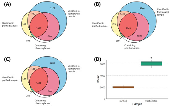For the purified sample, we identified 4554, 4130, and 3873 peptides (including non-phosphorylated ones) in replicate one, two, and three, respectively, with the coefficient of variation (CV) of 8.22%. For the fractionated sample, we identified 10,128, 12,647, and 10,653 peptides in replicate one, two, and three, respectively, with the CV of 11.93% (Figure 4A–C). These values correspond to 2.22-fold, 3.06-fold, and 2.75-fold increase in peptide identification in the first, second, and third replicate, respectively. Regarding the common peptides shared in both purified and fractionated samples, we identified 3405, 3375, and 3069 peptides in replicate one, two, and three, respectively (Figure 4A–C).