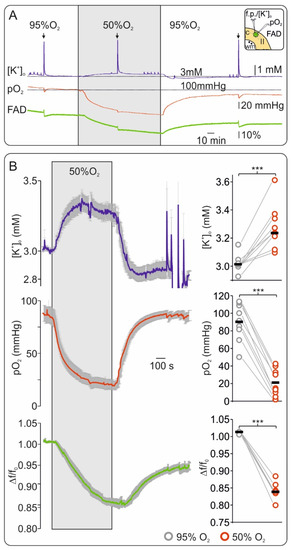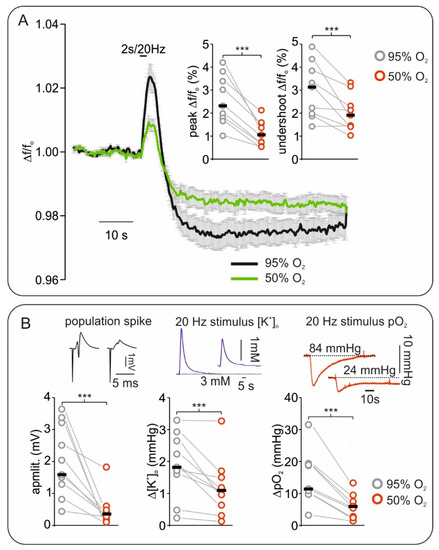 Effects of hypoxia on stimulus induced Flavin adenine dinucleotide (FAD) signals correlates with changes in electrophysiology. (A) Averaged curve of stimulus induced FAD transients elicited by 20 Hz/2 s stimulus train. Compared with the control (black curve), peak (oxidation) and undershoot (reduction) FAD response to stimulation decreased during hypoxia (green curve, error bars represent standard error). Right corner on top: plot of changes in FAD oxidative peaks and reductive undershoots during 95% and 50% oxygenation (grey circles: control, and red circles: hypoxia, black lines: median values). (B) Plots and exemplary traces of stimulus induced field potential, extracellular potassium ([K+]o) and tissue oxygenation (pO2) changes during hypoxia. Left, the amplitude of single pulse stimulus-induced population spikes (example on top) decreased during hypoxia suggesting impaired synaptic transmission. Middle: [K+]o increases elicited by 20 Hz tetanus decreased in amplitude under hypoxia. Right: pO2 dips simultaneously recorded with tetanus-induced FAD and [K+]o changes decreased. Plots: grey circles: control, red circles: hypoxia, and black lines: median values. All parameters were recorded simultaneously, n = 9, *** = p < 0.001.