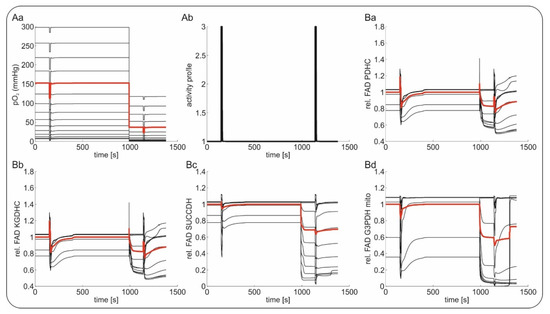 In silico reconstruction of the Flavin adenine dinucleotide (FAD) redox state during hypoxia in brain slices. (Aa) Reconstruction of tissue oxygenation (O2) gradients in a brain slice in experimental conditions under 95% and 50% oxygenation. (Ab) Similar to the increased energy demand elicited experimentally by electrical stimulation trains (20 Hz/2 s), periods of increased neuronal activation were simulated in silico by increasing intracellular Ca2+, which generated an activity-dependent drop in intracellular ATP. (Ba–d). Simulations of changes in FAD fluorescence in different layers during 95% and 50% O2 of pyruvate dehydrogenase (PDHC, (Ba)), α-ketoglutarate dehydrogenase (KGDHC, (Bb)), succinate dehydrogenase (SUCCDH, (Bc)) and mitochondrial glycereol-3-phophate dehydrogenase (G3PDHmito, (Bd)). Black lines depict the different layers of the slice; the red line gives the mean signal of all black lines.
