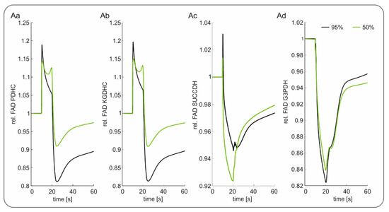 Modeling of relative changes in Flavin adenine dinucleotide (FAD) signaling during electrical stimulation with 95% oxygenation (black) and 50% oxygenation (green); (Aa) FAD signal of pyruvate dehydrogenase (PDHC); (Ab) FAD signal of α-ketogluterate dehydrogenase (KGDHC); (Ac) FAD signal of succinate dehydrogenase (SUCCDH); (Ad) FAD signal of mitochondrial glycereol-3-phophate dehydrogenase (G3PDH).