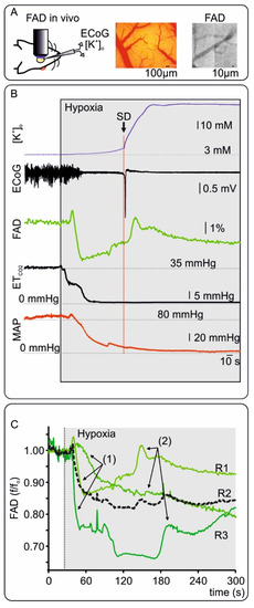 Changes in Flavin adenine dinucleotide (FAD) fluorescence in vivo during hypoxia. (A) Left: Representation of in vivo FAD microscopy combined with alternate current (AC) electrocorticography (ECoG) and extracellular potassium ([K+]o) measurements. Middle: Picture of the cortex with pial vessels. Right: CCD picture (460nm LED illumination and FAD filter) showing the cortical surface emitting fluorescence and dark pial vessels. (B) Exemplary experiment concerning in vivo changes in FAD during terminal hypoxia and related signals. A few seconds after beginning ventilation with 0% oxygen, [K+]o (blue, trace on top) gradually increased and cortical activity ceased (=non-spreading depression of activity, AC-ECoG trace). FAD-signal displayed a short oxidative peak followed by a marked reductive course. End tidal CO2 (ETCO2) and mean arterial pressure (MAP) decreased indicating circulatory arrest. After about 110 s of hypoxia and significantly after the circulatory arrest (defined as a fall of ETCO2 to zero and a MAP below 30 mmHg), terminal SD then occurred characterized by the sharp and large rise in [K+]o and parallel abrupt large negative shift of the direct current (DC)-ECoG. The terminal SD led to a last oxidative FAD-Peak. (C) FAD traces from three in vivo FAD measurements (R1-3) during hypoxia. Black dotted line represents the average curve of all traces. As shown previously, acute hypoxia is related to FAD reductive shift (1) and an oxidative peak when terminal SD occurs (2). The exemplary recording in B correspond to R1 in C. For details concerning the individual recordings, see supplementary Figure S2.