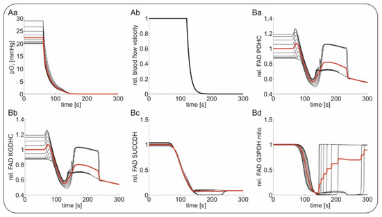 Stimulation of in vivo Flavin adenine dinucleotide (FAD) fluorescence during hypoxia and subsequent global ischemia-induced terminal spreading depolarization (SD); capillary tissue oxygenation (pO2) was decreased from 30 mmHg to 0 mmHg at t = 60 s followed by further substrate depletion during terminal SD. Red traces indicate average values of the black traces indicating the different layers around the vessel. (Aa) The course of the decrease in oxygen during simulated hypoxia mimicking in vivo experiments; (Ab) followed by maintained hypoxia, the relative blood flow velocity in the tissue was stopped, simulating the events of global ischemia and terminal SD; simulated relative changes signal of FAD bound to pyruvate dehydrogenase (PDHC, (Ba)); to α-ketogluterate dehydrogenase (KGDHC, (Bb)); to succinate dehydrogenase (SUCCDH, (Bc)) and to mitochondrial glycereol-3-phophate dehydrogenase (G3PDH, (Bd)).