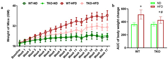 (a) High fat diet (HFD) significantly increased weight in both wild type (WT) and TXNIP knockout (TKO) mice. Six-week-old age and gender matched C57Bl/6J WT and TKO mice were randomized for feeding with either standard chow (normal diet; WT-ND and TKO-ND groups) or high fat diet (WT-HFD and TKO-HFD groups) for 18 weeks. Mice were weighed weekly and clearly HFD resulted in similar increases in weight gain in both WT-HFD and TKO-HFD mice when compared to their ND-controls over the 18 weeks (* p < 0.05, n = 11). (b) Area under the curve (AUC) analysis indicated that WT-HFD gained overall more weight when compared to TKO-HFD (# p < 0.05, n = 11).