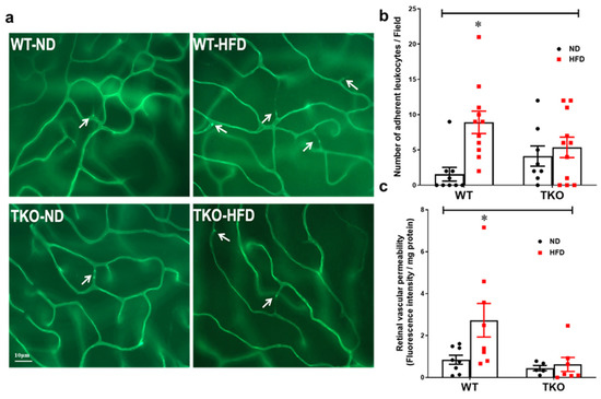 Retinal leukostasis was assessed by counting the number of adherent leukocytes labelled with Concanavalin-A that were physically occluding the poorly perfused retinal microvessels (Figure 2a). After 8 weeks, HFD significantly increased the number of adherent leukocytes (2.4-fold) in the retinal capillaries from WT-HFD when compared with WT-ND (Figure 2b, p < 0.05, n = 8–11). Deletion of TXNIP significantly prevented leukostasis in TKO-HFD compared with WT-ND and TKO-ND groups. Next, we evaluated the effects of HFD on inducing retinal vascular injury and BRB breakdown. As shown in Figure 2c, HFD induced BRB dysfunction evident by a 2.5-fold increase in extravasation of BSA-fluorescence in WT-HFD. Deletion of TXNIP preserved BRB function against HFD-mediated barrier dysfunction when compared to TKO-ND (p < 0.05, n = 5–8).