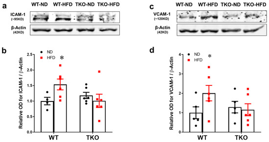 Traditionally, leukostasis is provoked by expression of endothelial cell adhesion molecules. Expression of intercellular adhesion molecules-1 (ICAM-1) and vascular cell adhesion molecule-1 (VCAM-1) was assessed after 8 weeks of HFD. As shown in Figure 3a,b, HFD significantly increased the expression of ICAM-1 (1.5-fold) and VCAM-1 (2.3-fold) in WT-HFD compared with WT-ND (p < 0.05, n = 4–6). Deletion of TXNIP significantly mitigated the HFD-induced expression of adhesion molecules (p < 0.05, n = 4–6).