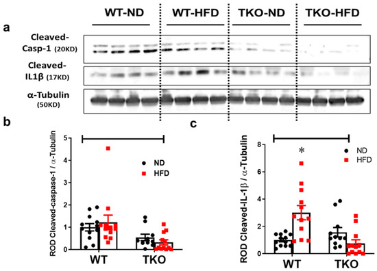 Our group previously showed that HFD increases the activation of NLRP3-inflammasome and drives the association between TXNIP and NLRP3 in the retina [16,17]. Here we examined the impact of HFD and TXNIP deletion on expression of NLRP3, cleaved caspase-1 and IL-1β after 8 weeks. HFD resulted in a significant increase (3-fold, p < 0.05, n = 10–12) in the retinal cleaved IL-1β expression in WT-HFD mice compared with WT-ND group (Figure 4a,c). HFD did show a trend but no significant increases in retinal NLRP3 expression (Supplementary Figure S2) or cleaved caspase-1 (Figure 4a,b) when compared with ND (n = 10–12). TXNIP deletion abolished the expression of NLRP3 (Supplementary Figure S2), cleaved caspase-1 (Figure 4a,b) and cleaved IL-1β (Figure 4a,c) in both TKO-ND and TKO-HFD mice compared with the WT-ND group.