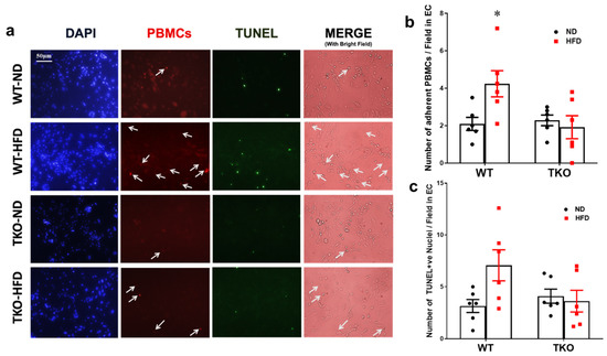 In order to examine the role of leukocyte-TXNIP in retinal leukostasis, isolated peripheral blood mononuclear cells (PBMNCs) from all mice groups (after 18 weeks of HFD) were incubated with mouse REC ex-vivo. PBMCs isolated from the WT-HFD group showed a 2-fold increase in the number of adherent labeled PBMCs compared with the WT-ND control group (Figure 7a,b, p < 0.05, n = 5–6). In parallel, PBMCs isolated from WT-HFD group showed a 1.8-fold increase, yet did not reach statistical significance in TUNEL-positive nuclei compared with the WT-ND control group (Figure 7c, p = 0.06, n = 5–6). In contrast, PBMCs isolated from TKO-HFD or TKO-ND showed no marked changes in REC death compared with WT-ND control group (Figure 7c).