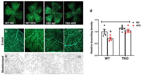In parallel, HFD also resulted in decreased retinal vascular branching density by 30% compared with the WT-ND control group. In contrast, TKO mice had comparable vessel branching density compared with WT-ND, which did not show changes in response to HFD (Figure 9b). We have also observed a similar trend in the overall vascular density per retina area (p > 0.05), but no change in vascular tortuosity was observed among all groups (data not shown).