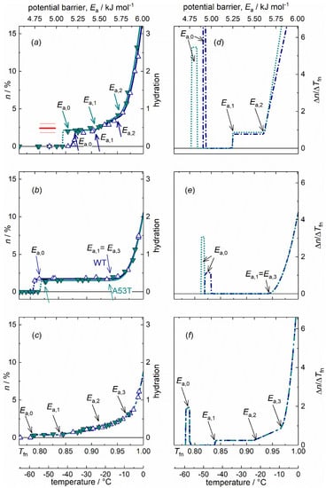 The MDs of WT and A53T αS monomers show rapidly changing trends as a function of potential barriers governing the motion of hydration water, except for a short constant region at the start of mobility (Figure 1a,d). The amount of mobile water molecules, h = 0.44(8) is enough to have functional proteins with approximate monolayer coverage at the smallest potential barriers below Ea,1, where a constant h region can be found (for definition of hydration see Section 4.3. Interpretation methods of the melting diagram). The mobile water concentration given as hydration provides a macroscopic measure. This level of mobile hydration water is equal to 3.5(6)·102 H2O/protein on the microscopic scale. While h given in g water/g protein units, measures the amount of mobile water on a macroscopic scale. Molecular dynamics simulations show that the measured behaviour corresponds to the first hydration layer of the structural ensemble of the protein [4]. Earlier NMR measurements and molecular dynamics simulations for individual amino acid’s hydration yield 4(1)·102 water molecules per amino acid sequence of the whole protein [30,32,33]. The comparison between our results and the predicted values (red line, Figure 1a) suggests that the solvent accessible amino acid residues are fully hydrated with mobile water molecules in the monomers as soon as water molecules are no longer rigid in the ice phase. The amount of homogeneously bound hydration water, n(Tfn0) = n(Ea,0) is as high as if every possible hydrogen bond site were occupied by a water molecule. This refers to an open structure.