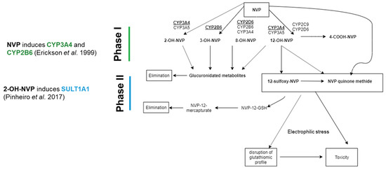 As mentioned above, NVP is an antiretroviral drug associated with severe hepatotoxicity, through the formation of reactive metabolites (Figure 1) [7]. NVP biotransformation comprises the formation of multiple Phase I metabolites (2-, 3-, 8-, and 12-OH-NVP, and 4-carboxy-NVP) that undergo subsequent Phase II glucuronidation or undergo detoxification trough GSH conjugation (Figure 1) [14]. NVP bioactivation pathways have also been proposed, namely the SULT1A1-mediated Phase II sulfonation of 12-OH-NVP to 12-sulfoxy-NVP; and the formation of NVP quinone methide from NVP, 12-OH-NVP and 12-sulfoxy-NVP. The reactive electrophilic metabolite NVP quinone methide has been proposed to be involved in the onset of NVP-induced liver toxicity through formation of covalent adducts with key proteins (Figure 1) [15]. Besides its extensive metabolism through Phase I and II enzymes, NVP has also the capability for induction of its own metabolism [14]. Indeed, NVP induces CYP2B6 and CYP3A4 [16], whereas its Phase I metabolite, 2-OH-NVP (Figure 1), induces SULT1A1 [6]. Therefore, due to its bioactivation, and subsequent detoxification and toxicity mechanisms, NVP has been shown to be a relevant drug for investigating drug metabolism and bioactivation competence of in vitro models [6,7].