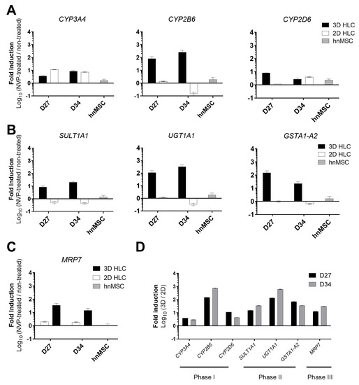 Gene expression analyses of Phase I, II and III related genes of 3D- and 2D-HLCs after 3 (D27) and 10 days (D34) of NVP treatment. (A) Gene expression of Phase I enzymes comprising CYP3A4, CYP2B6 and CYP2D6 in NVP-treated cells relative to non-treated cells. (B) Gene expression of Phase II enzymes comprising SULT1A1, UGT1A1 and GSTA1-A2 in NVP-treated cells relative to non-treated cells. (C) Gene expression of the MRP7 transporter in NVP-treated cells relative to non-treated cells. (A–C) Data for hnMSC exposed to NVP for 3 days and used as negative controls, are also shown. (D) Phase I, II and III gene expression in 3D-HLCs relative to 2D-HLCs in NVP-treated cells at D27 and D34. The data (Mean ± SD, n = 3) are normalized to the reference gene β-ACTIN and expressed as the log10 of the ratios.