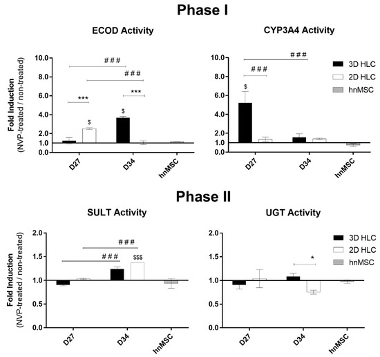 Phase I and Phase II enzymatic induction in 3D- and 2D-HLCs after 3 (D27) and 10 days (D34) of NVP treatment. The data for hnMSC, cultured in monolayer and exposed to NVP for 3 days, are presented as negative control. * p < 0.05 and *** p < 0.001 relative to 2D-HLCs, $ p < 0.05 and $$$ p < 0.001 relative to non-treated and ### p < 0.001 relative to D27 of culture. The data (Mean ± SD, n = 3) are represented as fold induction in NVP-treated cells relative to non-treated cells.