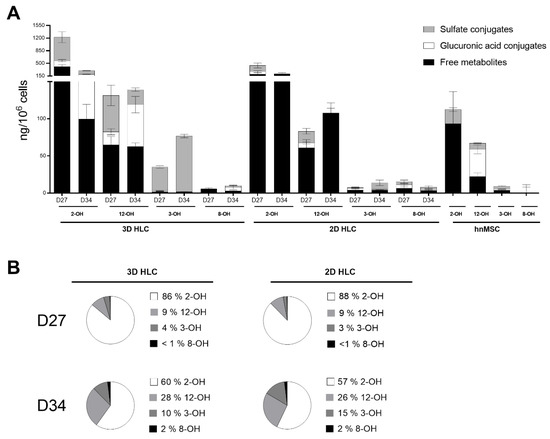 (A) Levels of NVP Phase I and II metabolites in 3D- and 2D-HLCs after 3 (D27) and 10 days (D34) of NVP treatment. hnMSC cultured in monolayer and exposed to NVP for 3 days are also shown and (B) relative proportions of total NVP metabolites (free metabolites + sulfate conjugates + glucuronic acid conjugates) at D27 and D34. The data (Mean ± SD, n = 3) are normalized to total cell number.