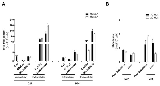 Glutathiolomic analysis of 3D- and 2D-HLCs at D27 and D34. (A) Total intracellular availability for cysteine (Cys), glutamylcysteine (GluCys) and glutathione and total extracellular levels of cysteinylglycine (CysGly) and glutathione; (B) Intracellular levels of protein-bound glutathione (GSSP) and free glutathione; * p < 0.05, ** p < 0.01 and *** p < 0.001 relative to 2D-HLCs. The data are represented as Mean ± SD, n = 3.