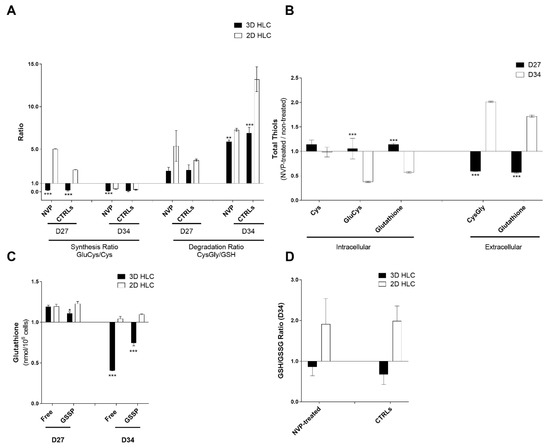 Glutathiolomic analysis of 3D- and 2D-HLCs treated or non-treated with NVP. (A) Effect of NVP on glutathione synthesis and degradation ratios, after 3 (D27) and 10 days (D34) of NVP treatment; (B) Effect of NVP on total intracellular availability for cysteine (Cys), glutamylcysteine (GluCys) and glutathione and total extracellular levels of cysteinylglicine (CysGly) and glutathione, in 3D-HLCs, after 3 (D27) and 10 days (D34) of NVP treatment; (C) NVP effect on intracellular levels of protein-bound glutathione (GSSP) and free glutathione, after 3 (D27) and 10 days (D34) of NVP treatment; (D) NVP effect on glutathione oxidation (intracellular GSH/GSSG ratio) after 10 days of NVP treatment (D34). * p < 0.05, ** p < 0.01 and *** p < 0.001 relative to 2D-HLCs. The data are represented as Mean ± SD, n = 3.