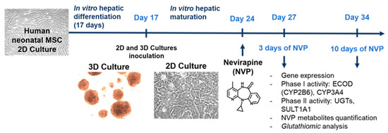 For NVP (Cipla, Mumbai, India) treatment, a stock solution was prepared in DMSO at a concentration of 150 mM. For cell incubation, NVP was diluted in complete medium to a final concentration of 300 µM. This concentration is considered non-cytotoxic and supra-therapeutic and was chosen according to values previously described in the literature [6,8,51,52,53]. HLCs at D24 of the differentiation protocol were exposed during 3 (D27) and 10 days (D34), whereas hnMSCs were treated for 72 h (Figure 7). Cell culture volume was adjusted in order to obtain a volume per cell equivalent in both 3D and 2D systems. Complete medium without NVP, as well as complete medium with solvent (supplemented with additional 0.2% DMSO) and without NVP were used as negative and solvent controls, respectively.
