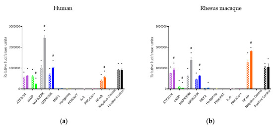 Activation of downstream signaling pathways in cells containing MORs from both human and rhesus macaque was assessed in the presence and absence of ligands using pathway-specific luciferase reporters (Figure 1). HEK293 cell lines containing either human or rhesus macaque MORs were reverse transfected into a Cignal Finder GPCR Signaling 10-Pathway Reporter Array (Qiagen; Valencia, CA, USA) that contained inducible transcriptional factor responsive luciferase reporter constructs for common GPCR downstream signaling pathways: ATF2/3/4, cAMP, MAPK/ERK, MAPK/JNK, MEF2, Hedgehog, PI3K/AFT, IL-6, PKC/Ca2+, and NF-ĸB. Because MOR is known to be Gi-linked, forskolin was added to the cells containing the cAMP reporter. ATF, cAMP, MAPK/JNK, MAPK/ERK, and NF-ĸB pathways showed significantly higher luciferase signals than the negative control under baseline treatment with saline, suggesting an endogenous activation of these pathways in the cell line or, in the case of cAMP, following forskolin addition. Downstream signaling following activation of MORs was tested using 10 μM DAMGO. Following DAMGO treatment, MAPK/JNK, MAPK/ERK, and NF-ĸB were significantly upregulated and cAMP was significantly downregulated for receptors from both species. These data demonstrate that for DAMGO, both rhesus macaque and human MORs showed similar responses on downstream pathways.
