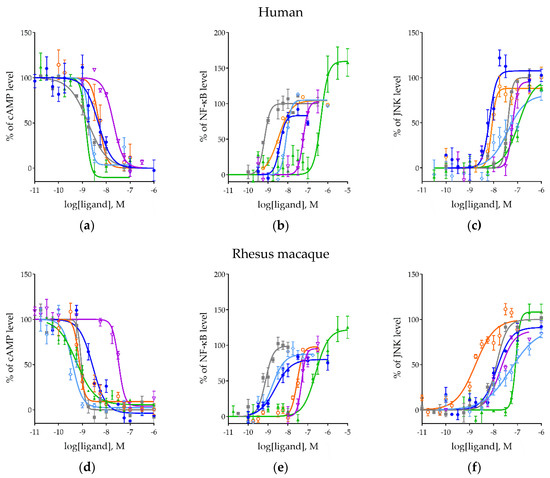 The concentration-dependent inhibition/activation of signaling by MOR ligands. Inhibition of forskolin-induced cAMP activation in human (a) and rhesus macaque (d) MORs. Stimulation of NF-ĸB in human (b) and rhesus macaque (e) MORs. Stimulation of MAPK/JNK in human (c) and rhesus macaque (f) MORs. Morphine (blue), met-enkephalin (cyan), endomorphin-1 (orange), β-endorphin (purple), and TRV130 (green).