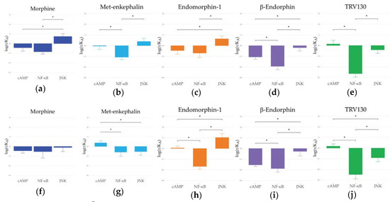 The ∆log() values from three pathways for all ligands are shown for human (a–e) and rhesus macaque (f–j) MORs. * indicates p < 0.05 between signaling pathways.
