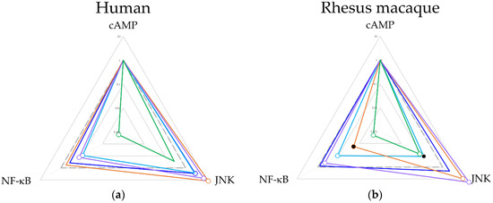 Web chart reflecting the calculated bias factor from ∆∆log() for all ligands in human (a) and rhesus macaque (b). Empty circles represent p < 0.05 on ∆log() values compared between the test ligand and the reference ligand DAMGO. Closed circles represent p < 0.05 on ∆log( ) values comparisons between human and rhesus macaque. Morphine (blue), met-enkephalin (cyan), endomorphin-1 (orange), β-endorphin (purple), TRV130 (green).