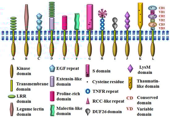 In Arabidopsis, RLKs represent the largest protein family with more than 600 members, constituting about 2.5% of its euchromatin; thus, eliciting the significance of this class of plant receptors. It is noteworthy that the phylogenetic analysis of RLKs with other protein kinases of Arabidopsis validates the monophyletic origin of RLKs. Out of the 610 genes encoding for RLKs, 417 encode for receptor kinases while the other 193 lack the signature signal sequence and/or transmembrane sequence indicating that these might be cytoplasmic kinases (RLCKs) [10]. Based on the signature motifs in the ectodomains of receptor kinases, Arabidopsis transmembrane RLKs can be classified into 14 types, viz., leucine-rich repeat (LRR), lectin (C-Lectin and L-Lectin), wall-associated kinase (WAK), extensin like, proline-rich extensin like (PERK), Catharanthus roseus like (CrRLK), self-incompatibility domain (S-domain), CRINKLY-like (CR-like), the domain of unknown function 26 (DUF26), lysin motif (LysM), thaumatin, leaf rust kinase-like (LRK), receptor-like kinase in flowers (RKF), unknown receptor kinase (URK), of which the biological role of only a few have been studied in detail [17,18,19,20,21,22,23,24,25,26,27,28,29,30,31,32,33,34,35] (Table 1). Some of these RLK types are placed under different subfamilies due to the phylogenetic distinctness of their kinase domains [5]. This suggests probable functional diversification such that single isoforms may comply with different specificities. The structural features of different types of RLKs are explained here (Figure 1).