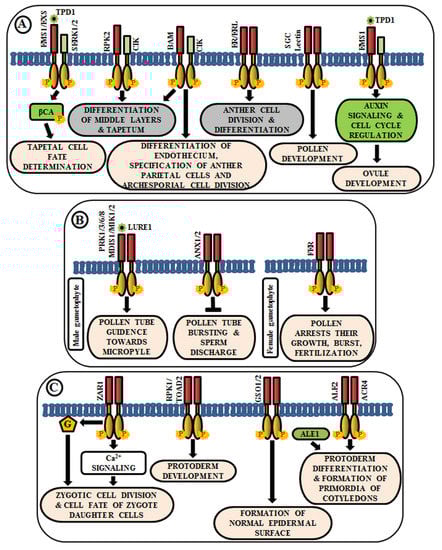 Arabidopsis RLKs in the regulation of growth and development. A few examples of RLKs that regulate (A) anther and ovule development, (B) pollen-pistil interaction, and (C) embryo development.