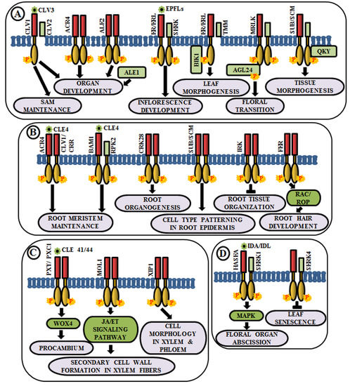Arabidopsis RLKs in the regulation of growth and development. A few examples of RLKs that regulate (A) shoot development, (B) root development, (C) vascular tissue development, and (D) organ abscission.