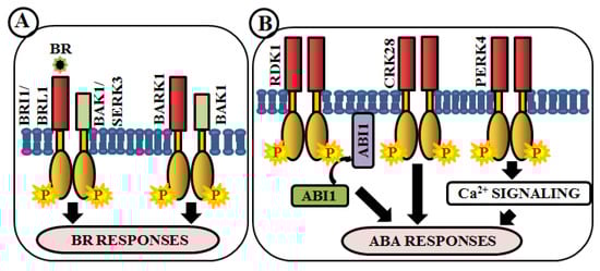 Arabidopsis RLKs in brassinosteroid (BR) and abscisic acid (ABA) signaling. RLK-mediated phosphorylation-based signaling circuits regulate BR (A) and ABA (B) responses.
