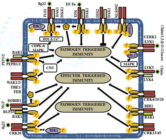 Plants sense the invasion of pathogens through the perception of pathogen and host-derived elicitors, like MAMPs, PAMPs, DAMPs, and HAMPs (herbivore associated molecular patterns). To combat the attack of invading pathogens, RLK-mediated signaling boosts transcriptional activation of multiple defense and pathogenesis-related genes to eliminate the adversity caused by the pathogens. These kinds of RLKs are also termed as ‘pattern recognition receptors’ (PRRs) and the resulting immune response is called pathogen-triggered immunity (PTI). Predominantly, RLK-derived signals activate defense responses like hypersensitive response, stimulation of ion fluxes, ROS (reactive oxygen species) production, synthesis of phytoalexins, salicylic acid (SA) accumulation, and cell wall reinforcement [6,140,141]. Some important examples of Arabidopsis RLKs involved in defense responses are discussed here.