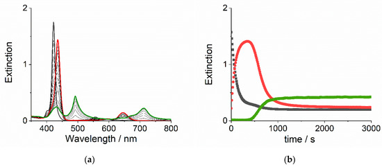(a) UV/Vis extinction spectral changes for the demetallation of ZnTPPS4 (black) into H2TPPS4 (red) and the consecutive formation of J-aggregates (green), after the addition of sulfuric acid (experimental conditions: [ZnTPPS4] = 3 μM; [H2SO4] = 0.05 M, IS = 0.6 M by ZnSO4, T = 298 K, total acquisition time 3000 s). (b) Extinction time traces at 422, 434 and 490 nm for the same kinetic run.