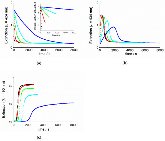 Extinction time traces for kinetic experiments on demetallation of ZnTPPS4 at constant ionic strength and different acid concentrations: (a) at 422 nm (in the inset the semilogarithmic plots according to a first order rate law are reported); (b) at 434 nm and (c) at 490 nm. (Experimental conditions: [ZnTPPS4] = 3 μM; [H2SO4] = 0.01 (blue), 0.02 (cyan), 0.03 (green), 0.05 (red) and 0.1 M (black), IS = 0.6 M by ZnSO4, T = 298 K).