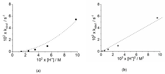 Plot of the pseudo-first order rate kobs1 (s−1) for the demetallation of ZnTPPS4 at constant ionic strength as function of (a) [H+] (dashed line is the best fit to the function kobs1 = k2[H+]2) and (b) [H+]2 (dashed line is the linear fit of the experimental data).
