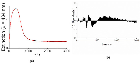 (a) Extinction time trace for the demetallation of ZnTPPS4 (3 μM) and the consecutive formation of H2TPPS4 J-aggregates at constant ionic strength (IS = 0.6 M, ZnSO4) and [H2SO4] = 0.05 M. The solid line represents the best-fitted curve to the experimental data according to Equation (3). (b) Residuals, accounting for the validity of the model, are shown on the bottom.