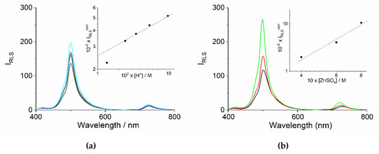 RLS spectra of the samples at the end of the aggregation process for the experiments at variable [H+] ([H2SO4] = 0.01 (black), 0.02 (green), 0.03 (red), 0.05 (blue) and 0.1 M (cyan)) and fixed ionic strength (IS = 0.6 M) (a) and at variable ionic strength [ZnSO4] = 0.4 M (black), 0.6 M (red) and 0.8 M (green) and fixed [H+] ([H2SO4] = 0.05 M) (b). The inset of both frames report the log–log plots of the RLS intensity at maxima corrected for the extinction of the samples as function of [H+] (left) and [ZnSO4] (right).